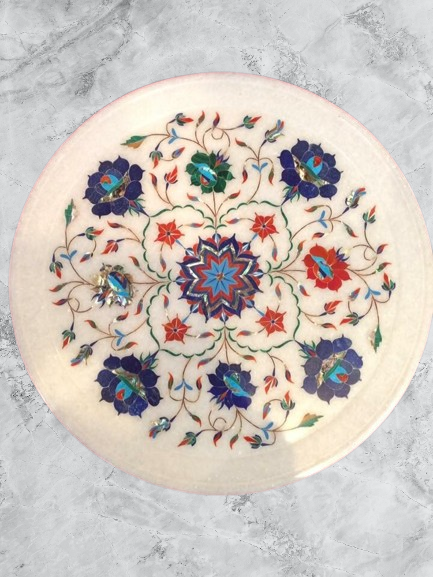 Handcrafted by descendants of Taj Mahal artisans, these marble table tops feature traditional inlay art (Parchinkari), using semi-precious stones set into Indian marble. Available in various shapes and designs, they’re durable, elegant, and suitable for both indoor and outdoor use.