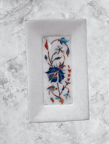 THE Exclusive Blue Bloom Marble Inlay Tray handcrafted by Makrana marble tray featuring intricate blue floral inlay. Inspired by Persian art and the timeless Parchin Kari technique, it’s perfect for serving, coffee table styling, or displaying jewelry. A blend of heritage craftsmanship and modern elegance.