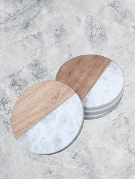This MARBLE WOOD COASTER Elevate your table setting with AR Handicraft’s stunning coasters, where natural elegance meets modern design. Crafted with a seamless blend of polished marble and rich wood, each piece reflects our commitment to timeless craftsmanship. The cool marble offers a sleek surface for your drinks, while the warm wood adds a rustic charm—creating a sophisticated contrast that protects your surfaces and enhances any décor.